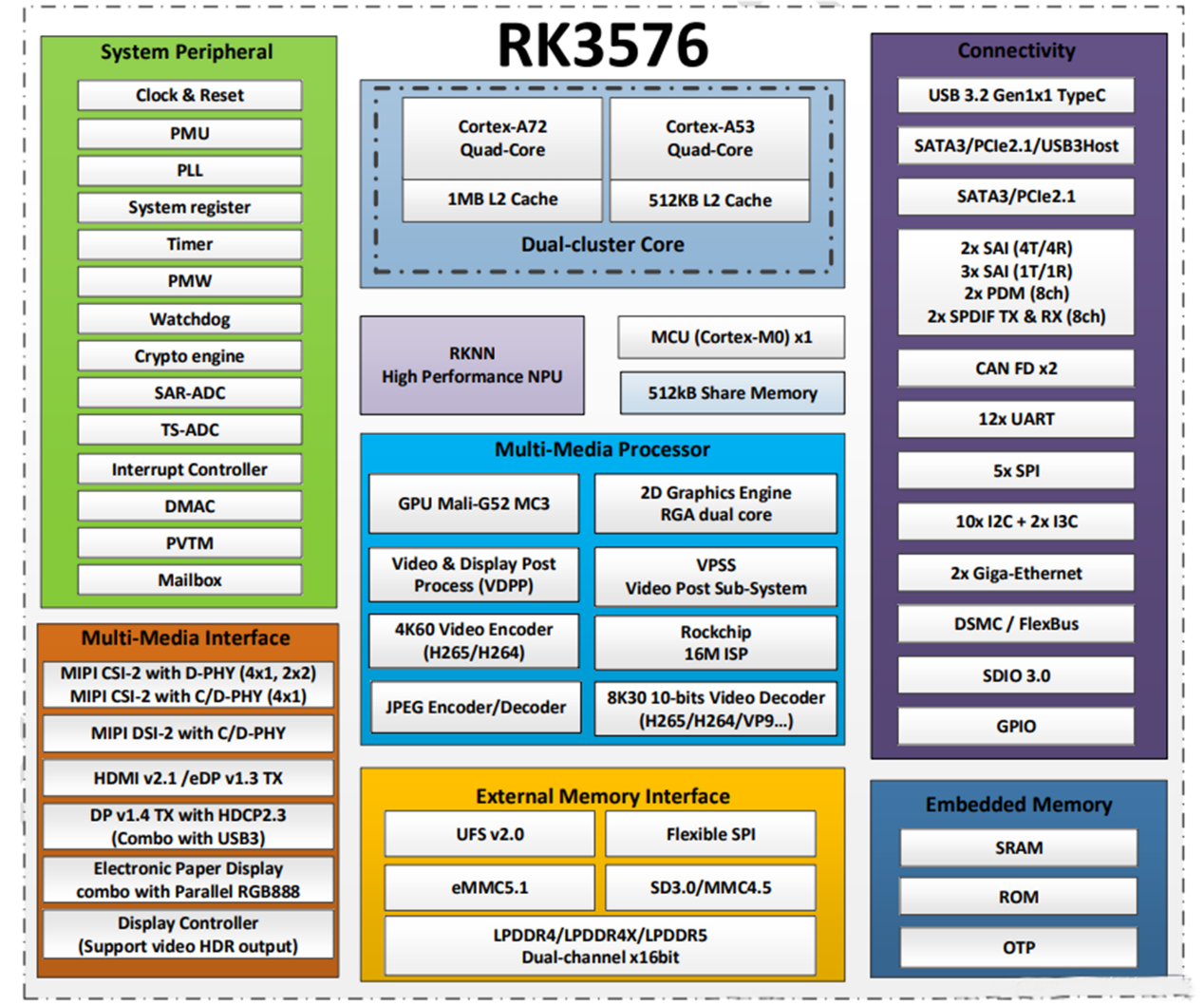 Rockchip RK3576 Andre generasjons 8NM AIT-plattform med høy ytelse er en høy ytelse, Low-Power SOC (System-on-Chip) prosessor som er egnet for en rekke applikasjonsscenarier som ARM-baserte PC-er, Edge-dataenheter og personlige mobile internettenheter. Den bruker en åtte-kjerne CPU basert på ARM-arkitekturen, integrerer en uavhengig 6TOPS (TERA-operasjoner per sekund) NPU (Neural Network Quad Processing Unit), integrerer flere databehandlingskjerner som GPU, MCU, VPU, og har et rikt perifert grensesnitt for å oppfylle de komplekse scenekravene. I tillegg støtter RK3576 også UFS (Universal Flash Storage) -lagring, og gir effektiv datalagring og lesefunksjoner.