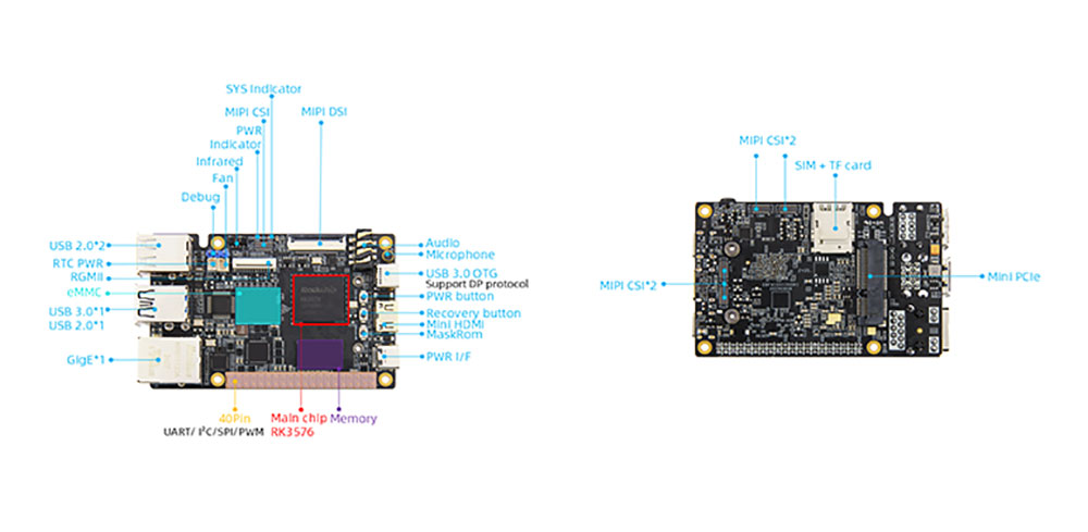 4. Ombord Gigabit Ethernet -port, RGMII, USB3.0/2.0, Mini PCLE, Mini HDMI, MIPI -skjerm og MIPI -kamera og andre perifere grensesnitt, som fører ut 40 pin ubrukte pinner, rike ekspansjonsgrensesnitt for å møte flere utviklingsbehov!