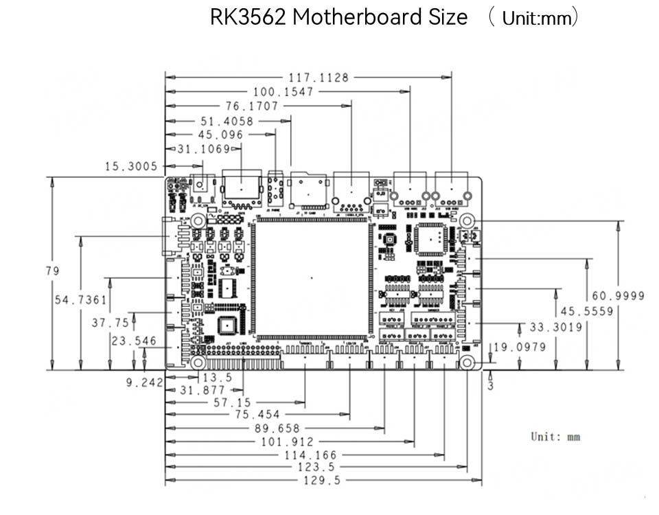 Modell: RK3562/RK3562JCPU: Quad-Core Cortex-A53, hovedfrekvens opp til 2,0GHZGPU: Mali-G52NPU: 1TOPS Computing Power (industriklasse RK3562J uten NPU)
